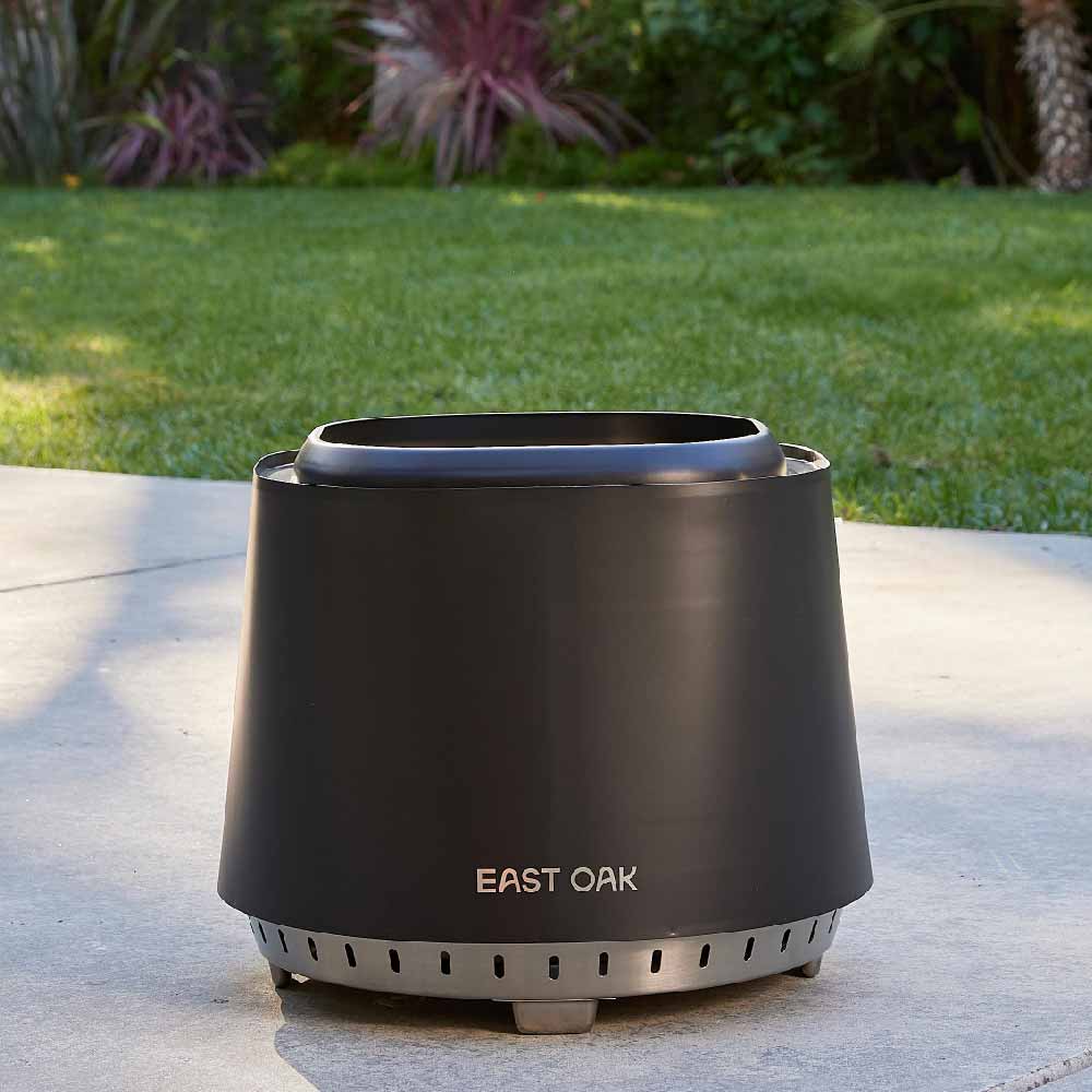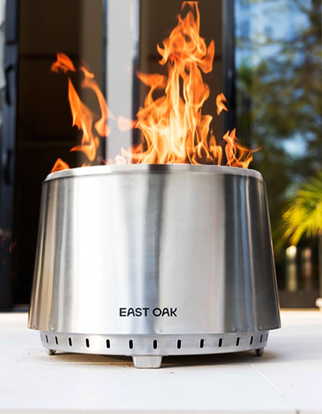 Luft wird in einen Hohlraum an der Basis gesaugt und zirkuliert innerhalb der Doppelwand, während sich das Feuer erhitzt. Die erhitzte Luft steigt dann durch den Spalt zwischen den Wänden auf und fördert die Verbrennung, während das Feuer brennt.