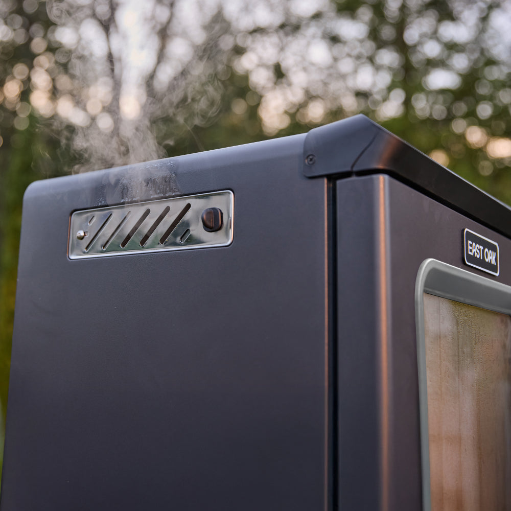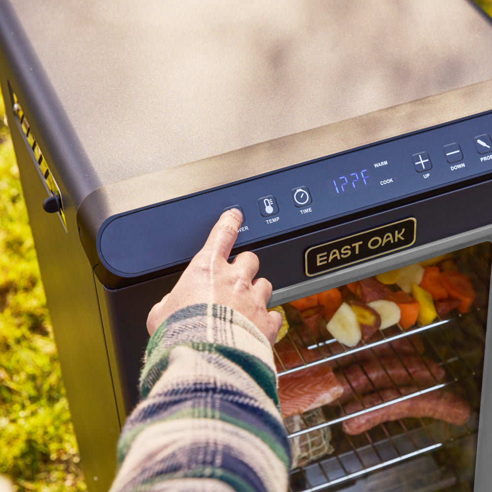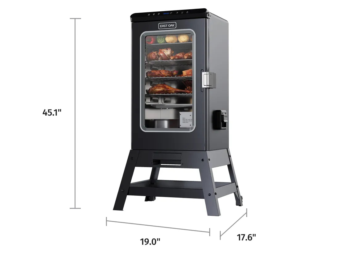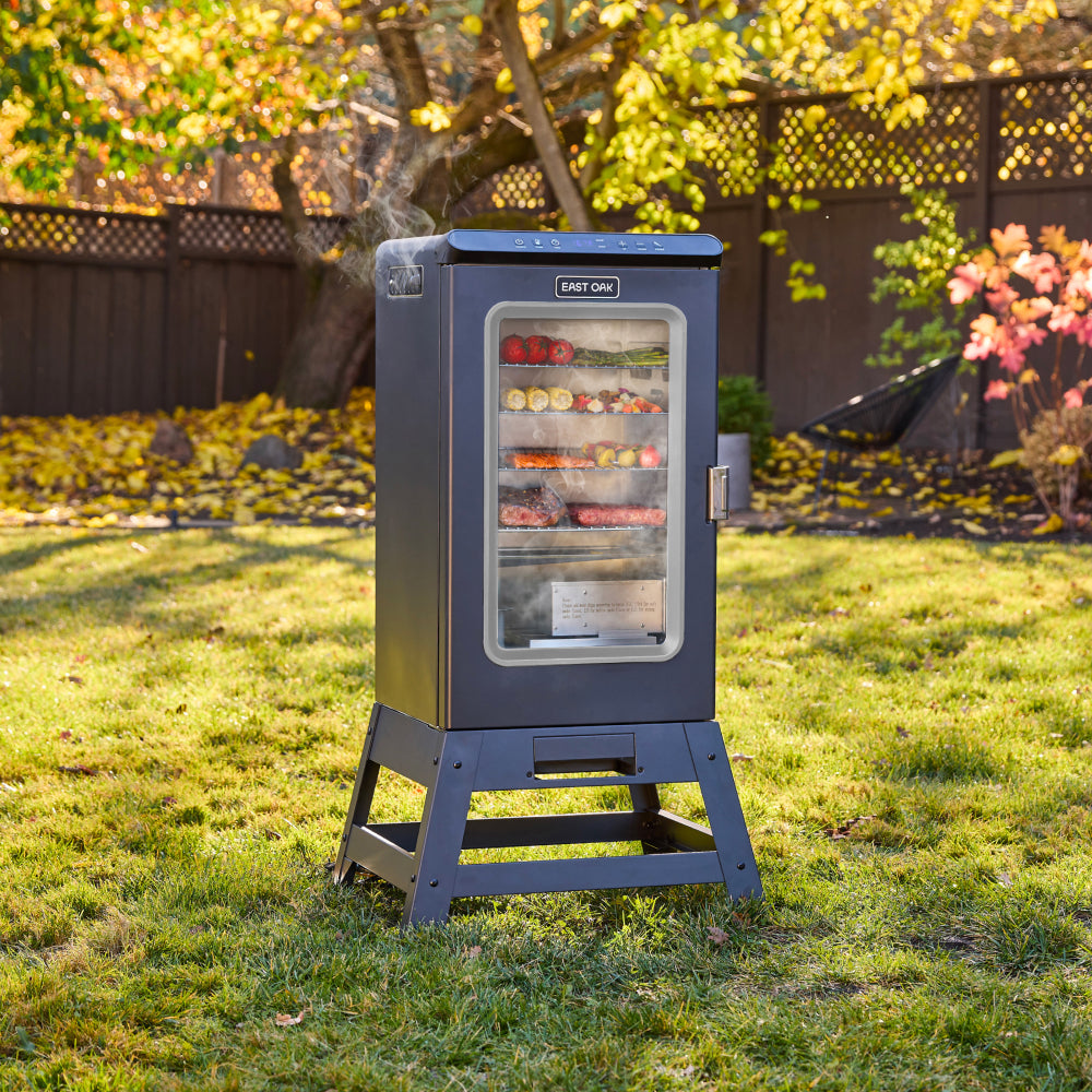 East Oak Ridgewood Pro 725-sq smoker with window: Upgraded digital controls, built-in legs & side wood loarder. 800W power + set-and-forget ease. Smoke like a pro!