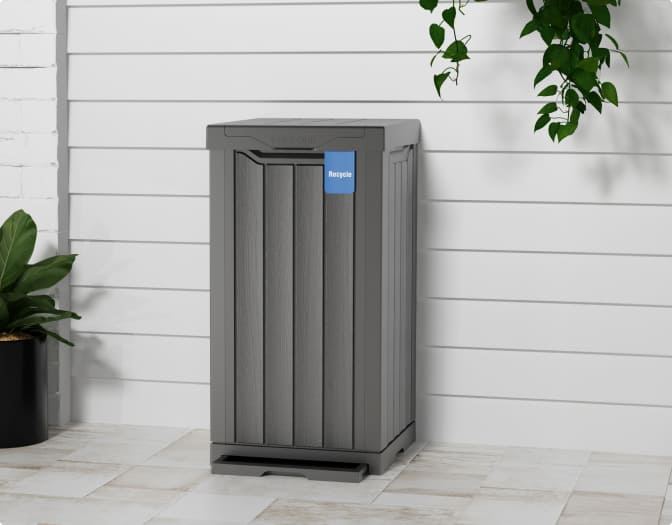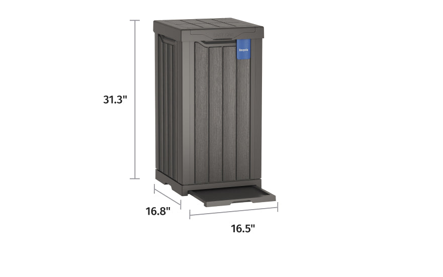 31 gallon outdoor trash can made of durable resin, fits 30-33 gal bags. Removable sorting panels for recycling, weatherproof, and designed for easy bag removal.