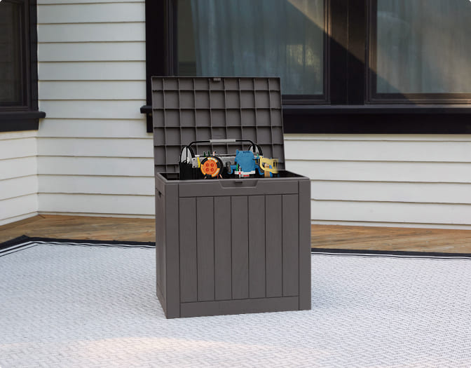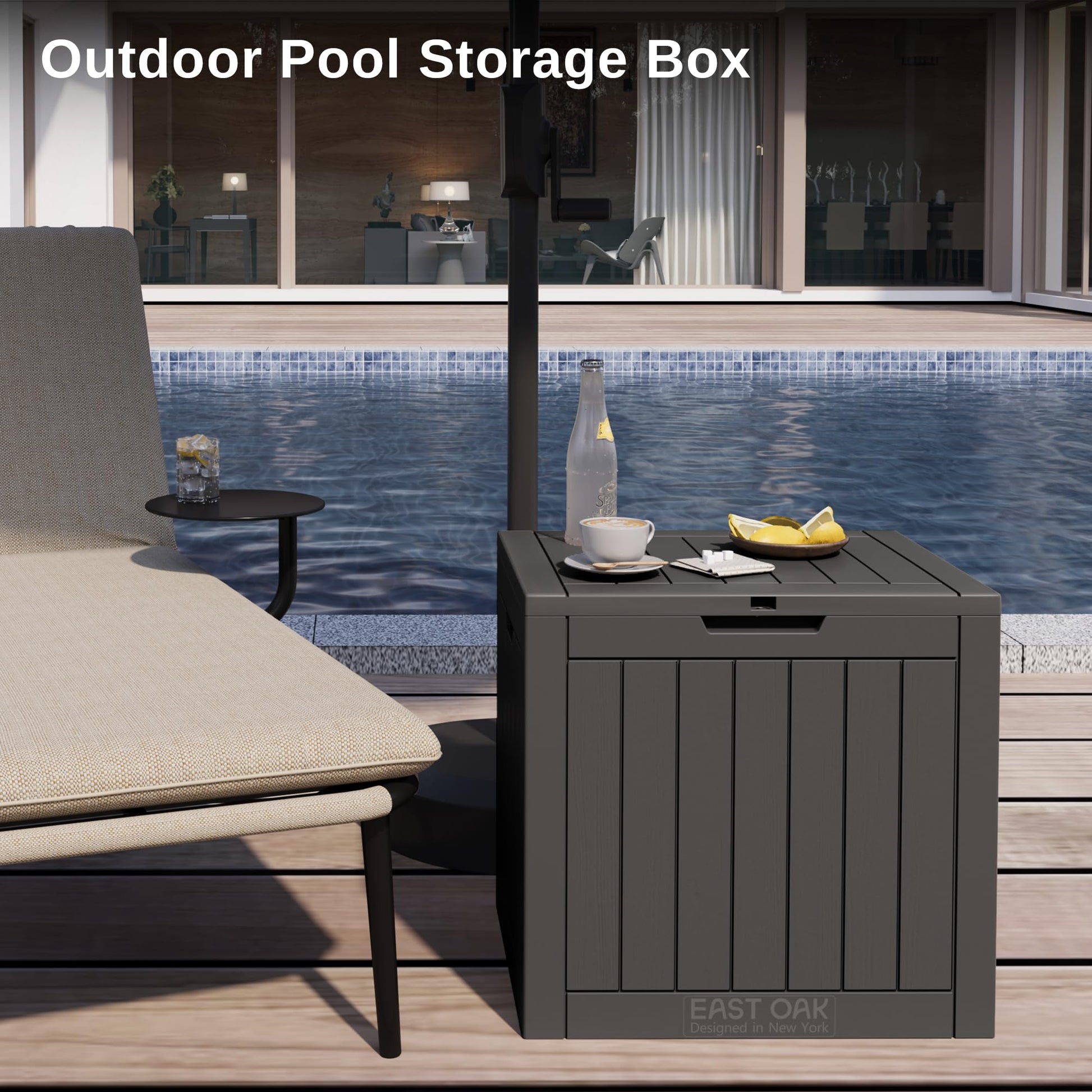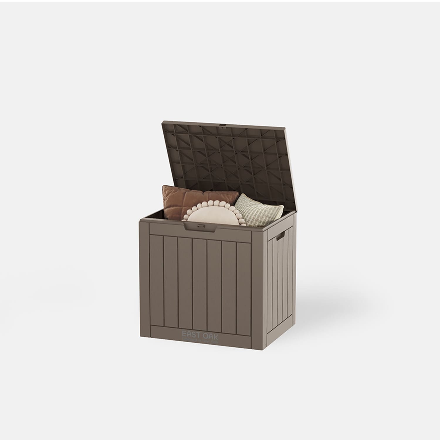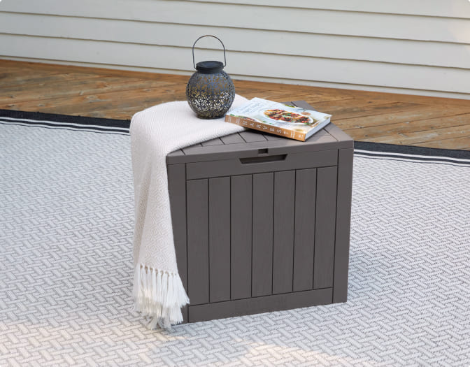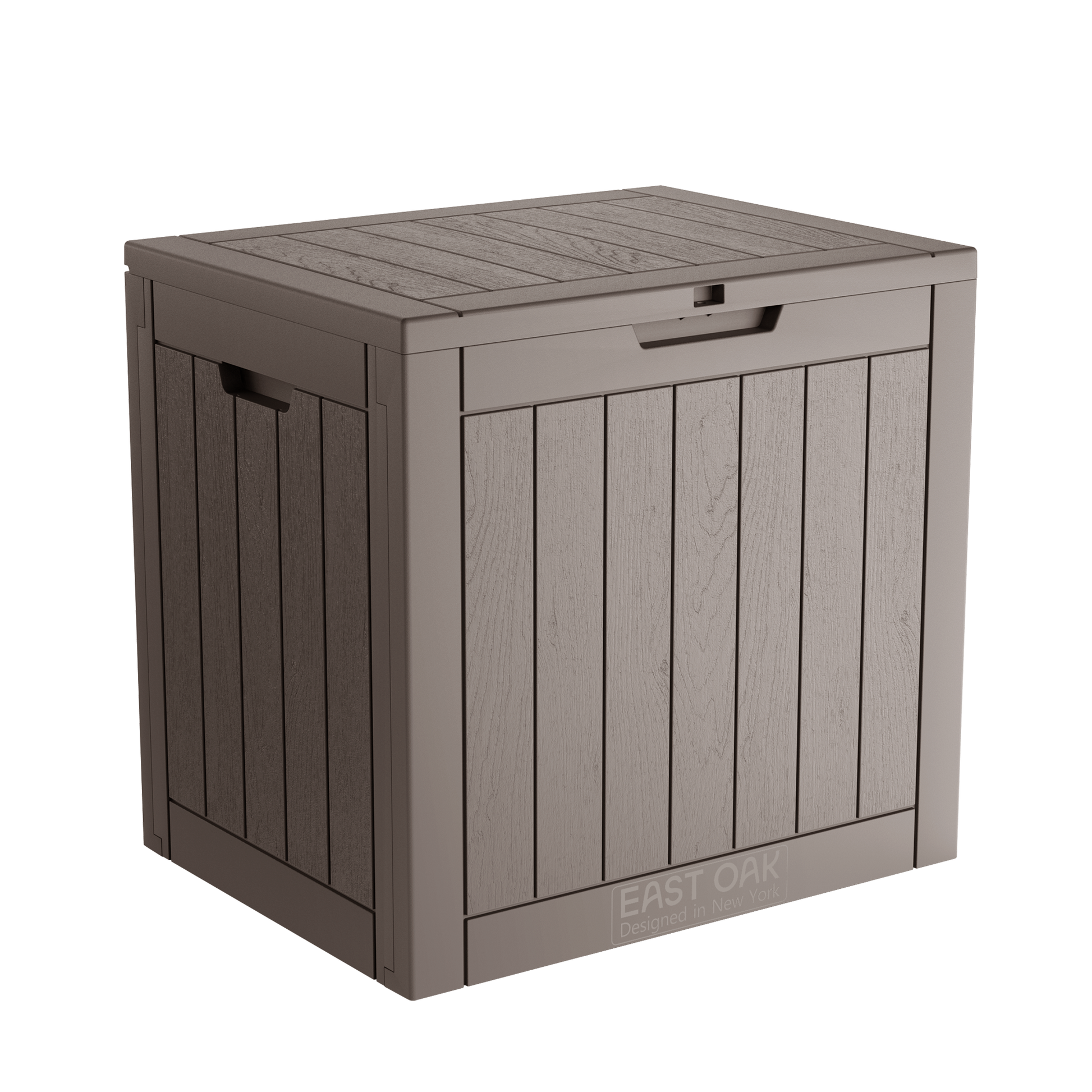 31-gal East Oak deck box for indoor/outdoor storage. Waterproof, UV-resistant resin with 170 lb capacity—use as extra seating or a table. Easy 10-min assembly.