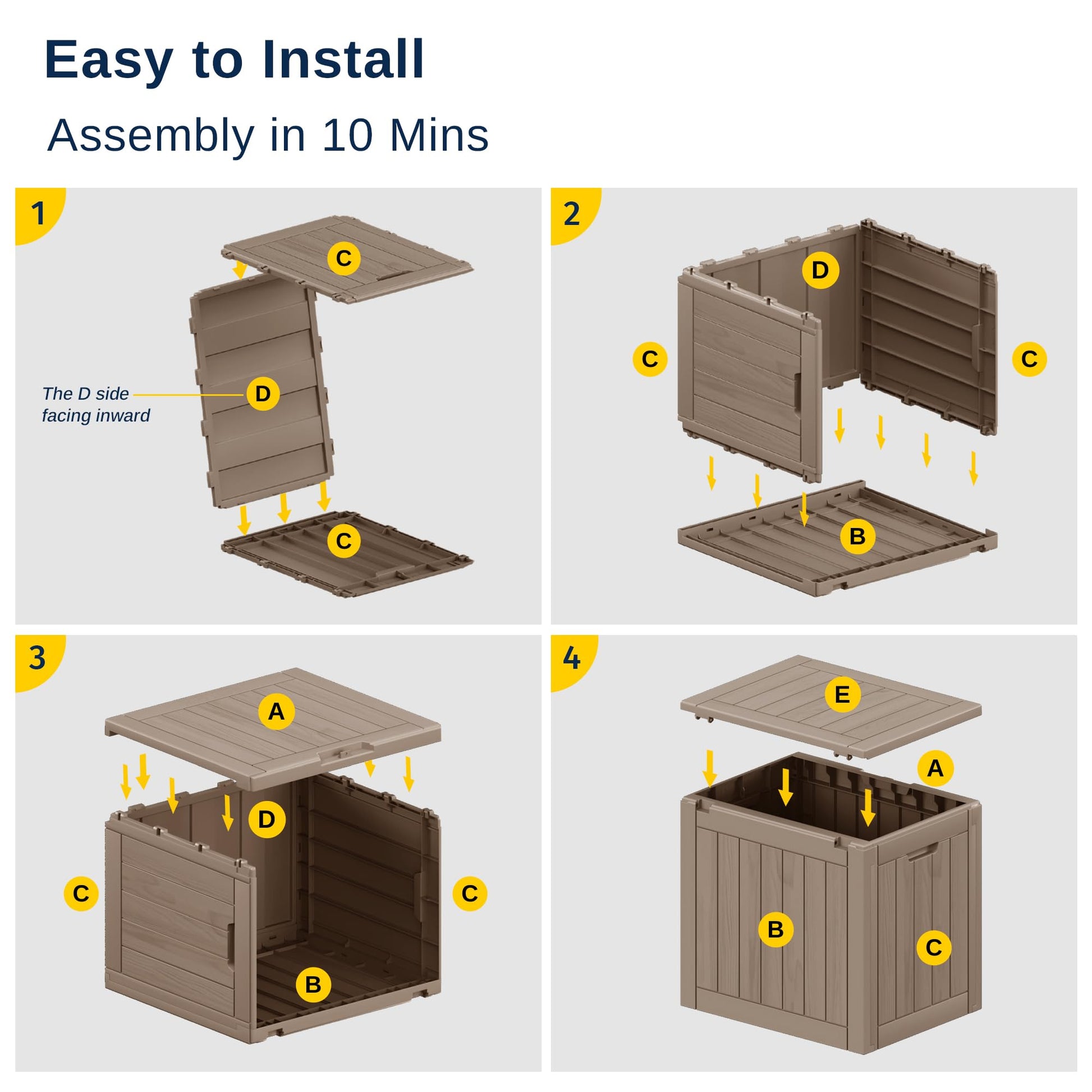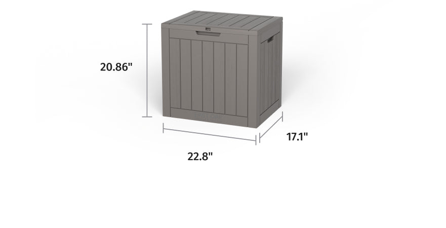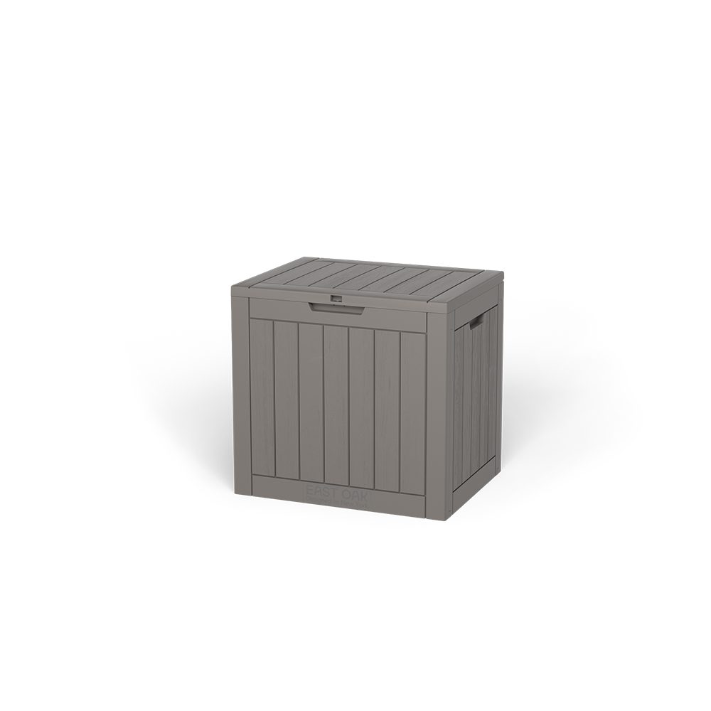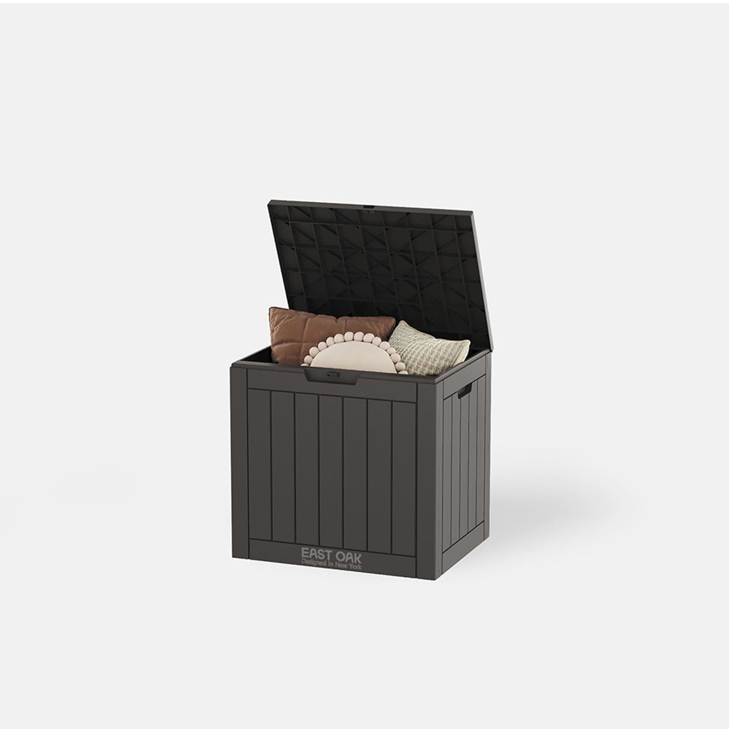 31-gal East Oak deck box for indoor/outdoor storage. Waterproof, UV-resistant resin with 170 lb capacity—use as extra seating or a table. Easy 10-min assembly.