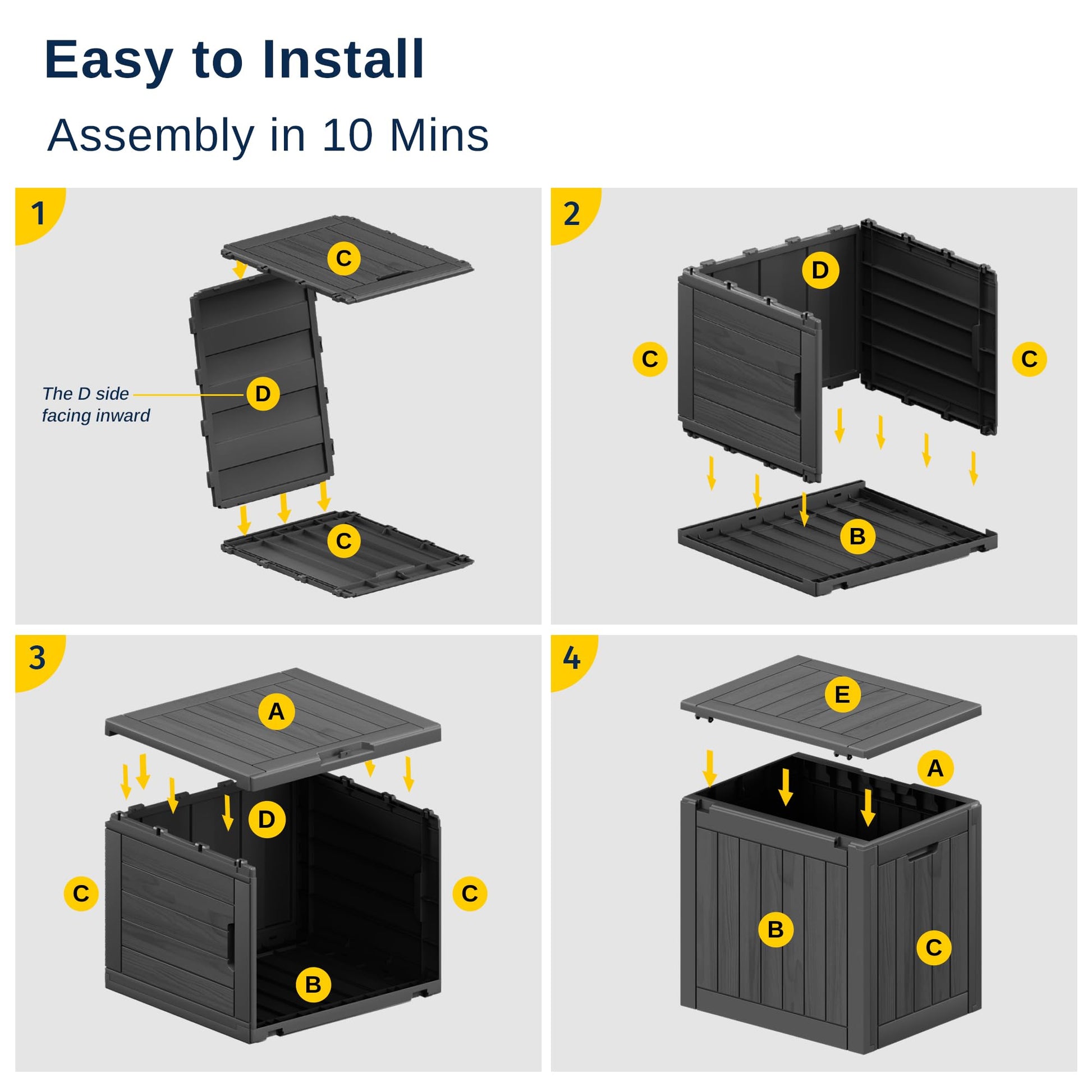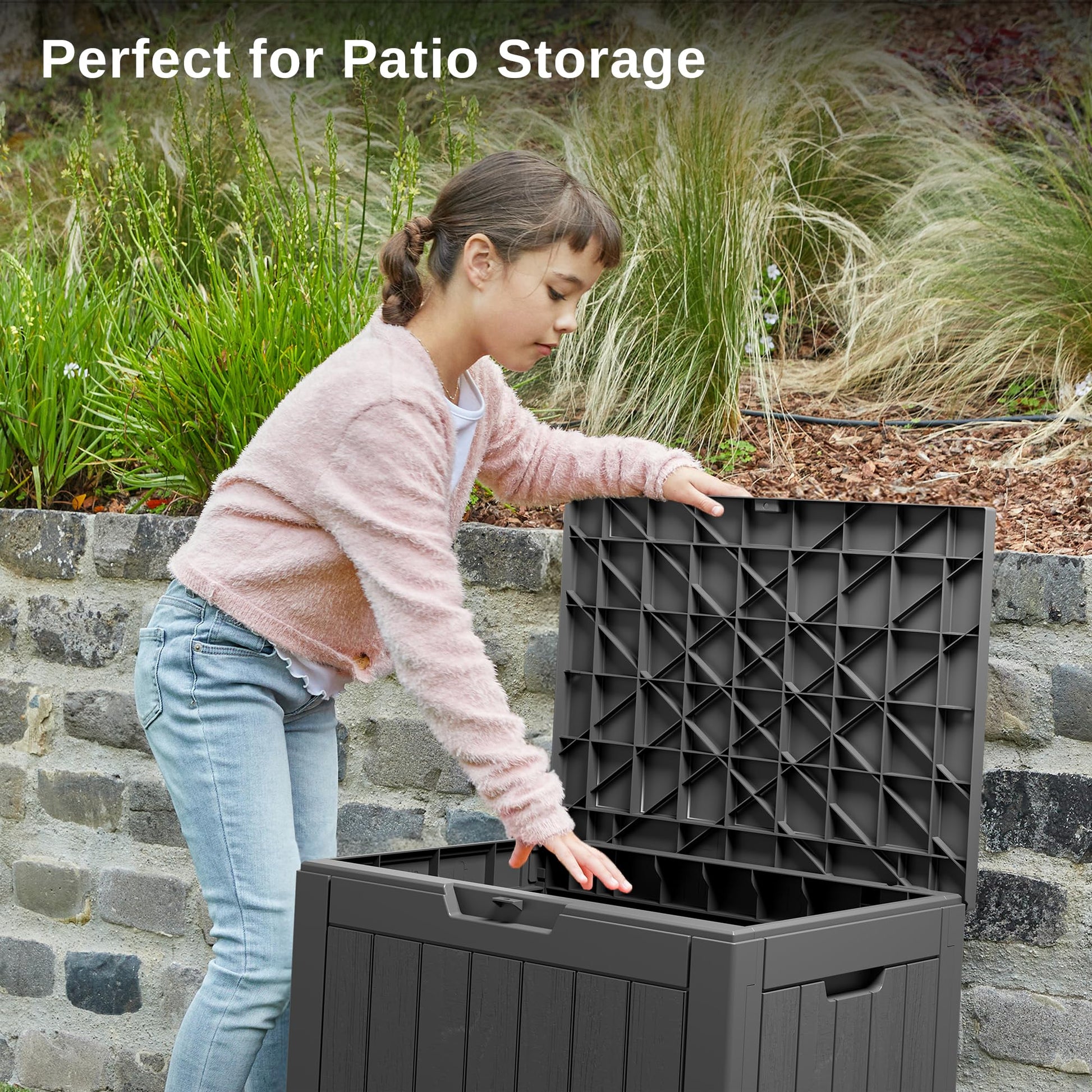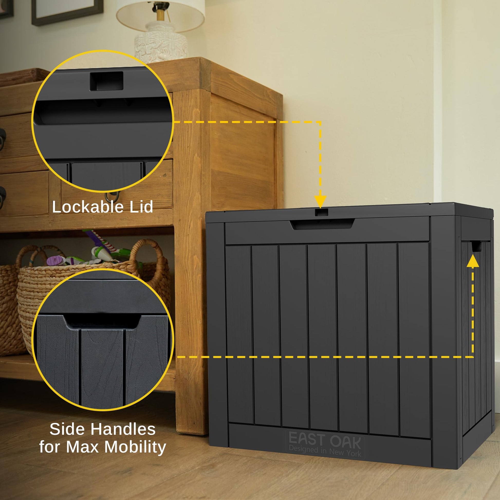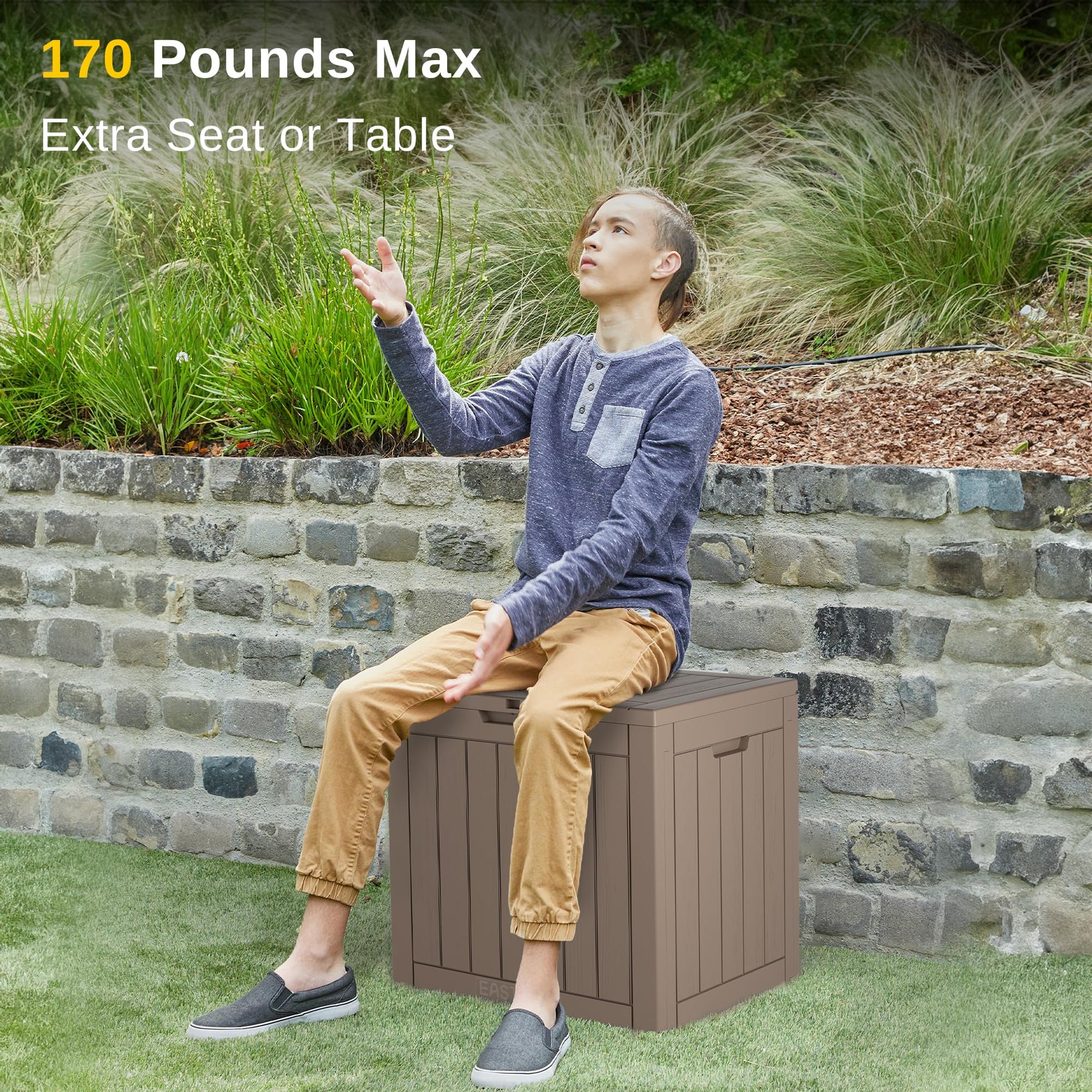 31-gal East Oak deck box for indoor/outdoor storage. Waterproof, UV-resistant resin with 170 lb capacity—use as extra seating or a table. Easy 10-min assembly.