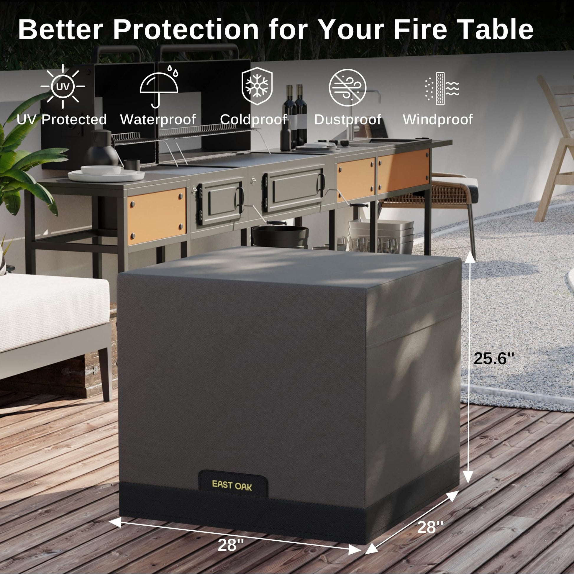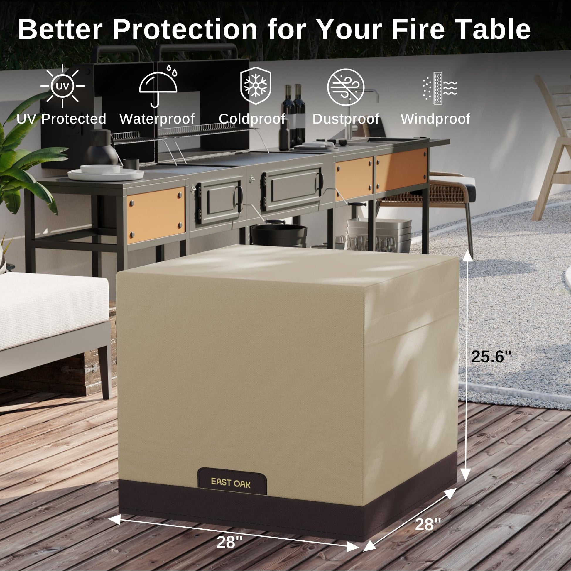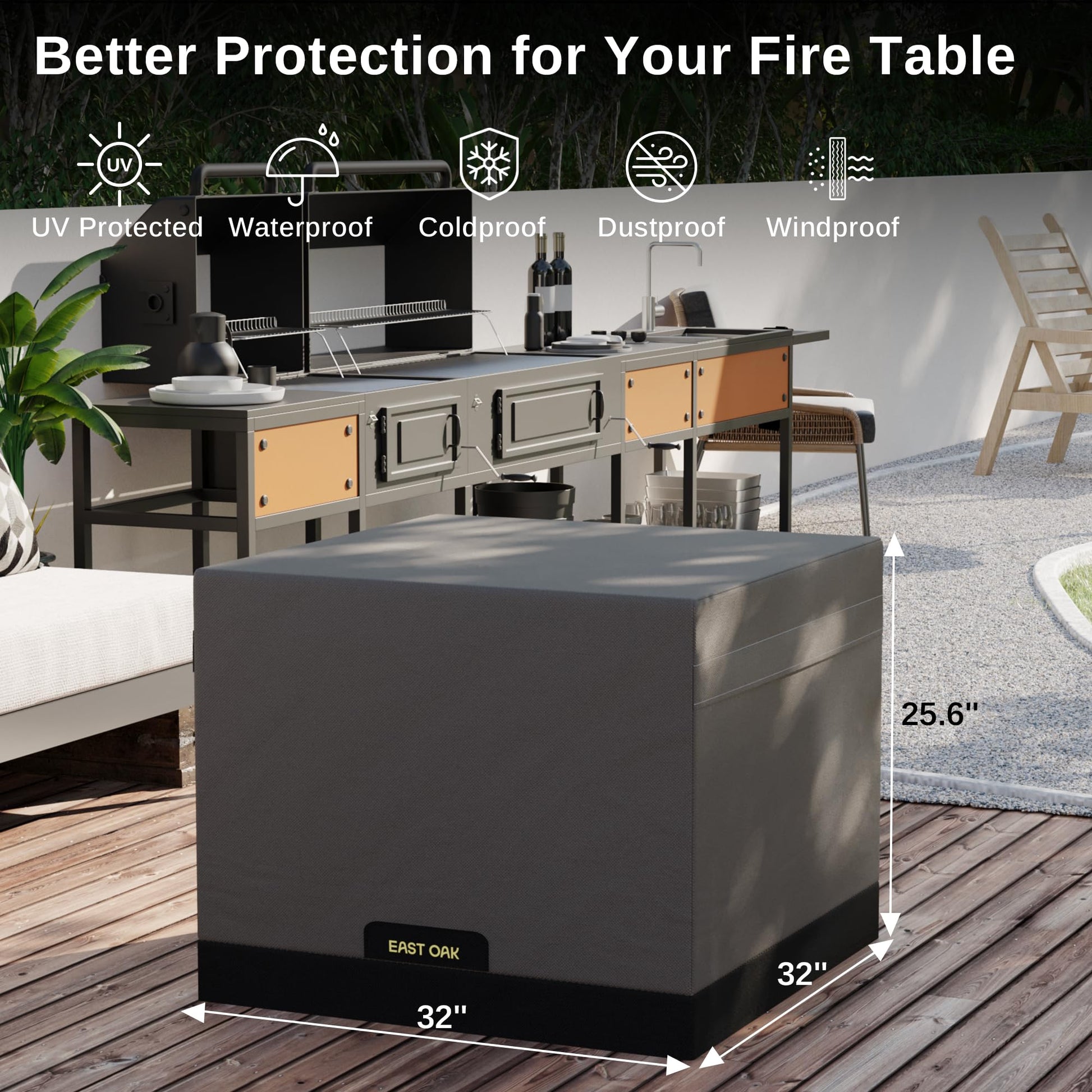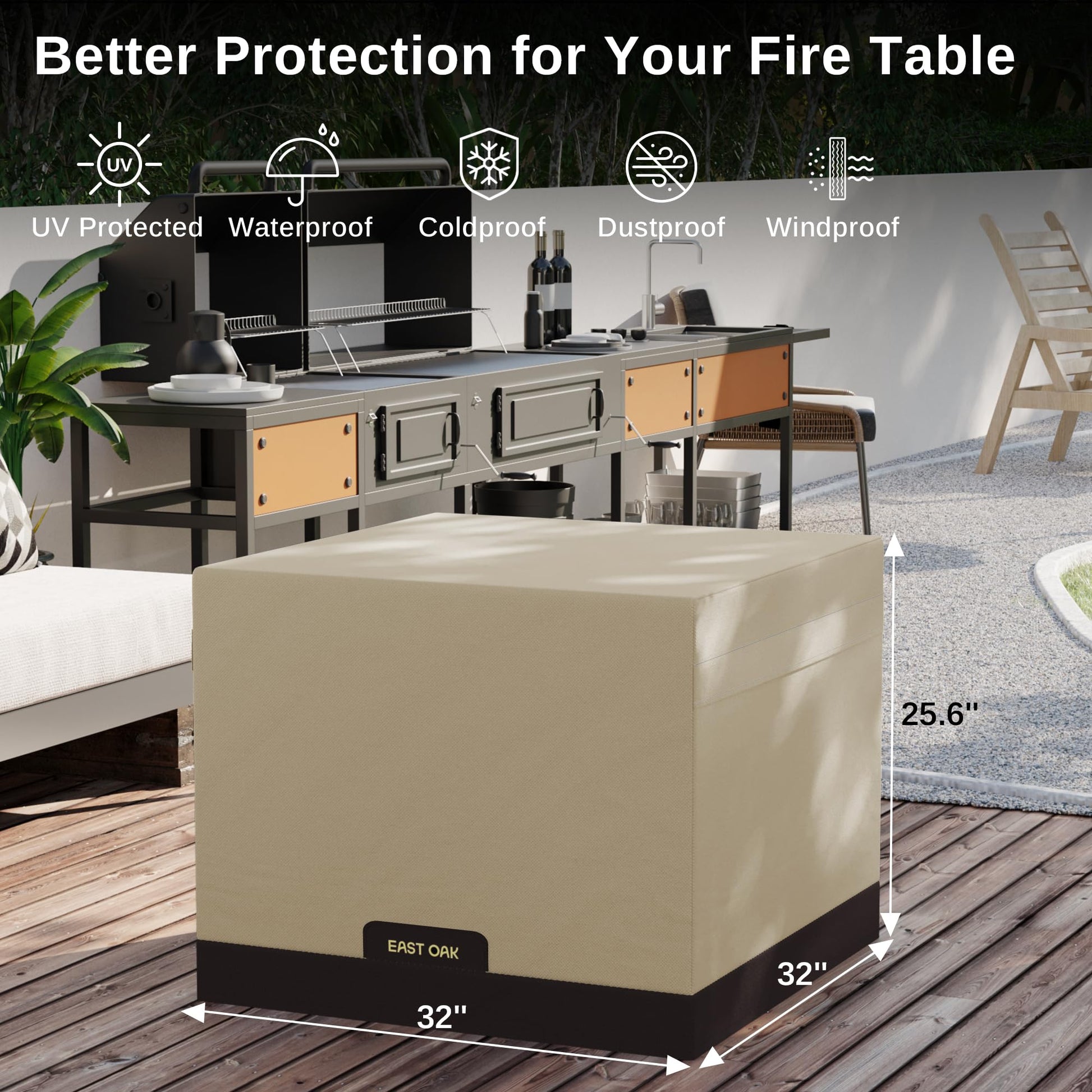 The East Oak 32-inch fire table cover, measuring 32''L x 32''W x 25.6''H, is specifically designed to perfectly fit most 32-inch fire tables across various brands.