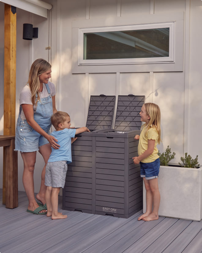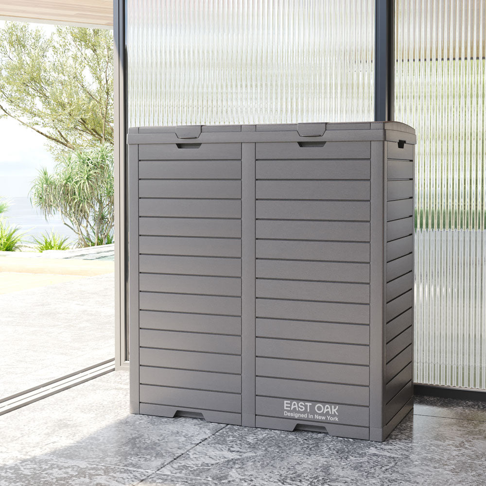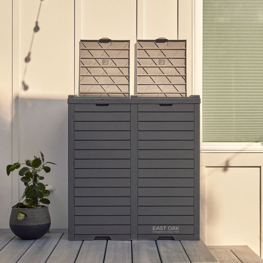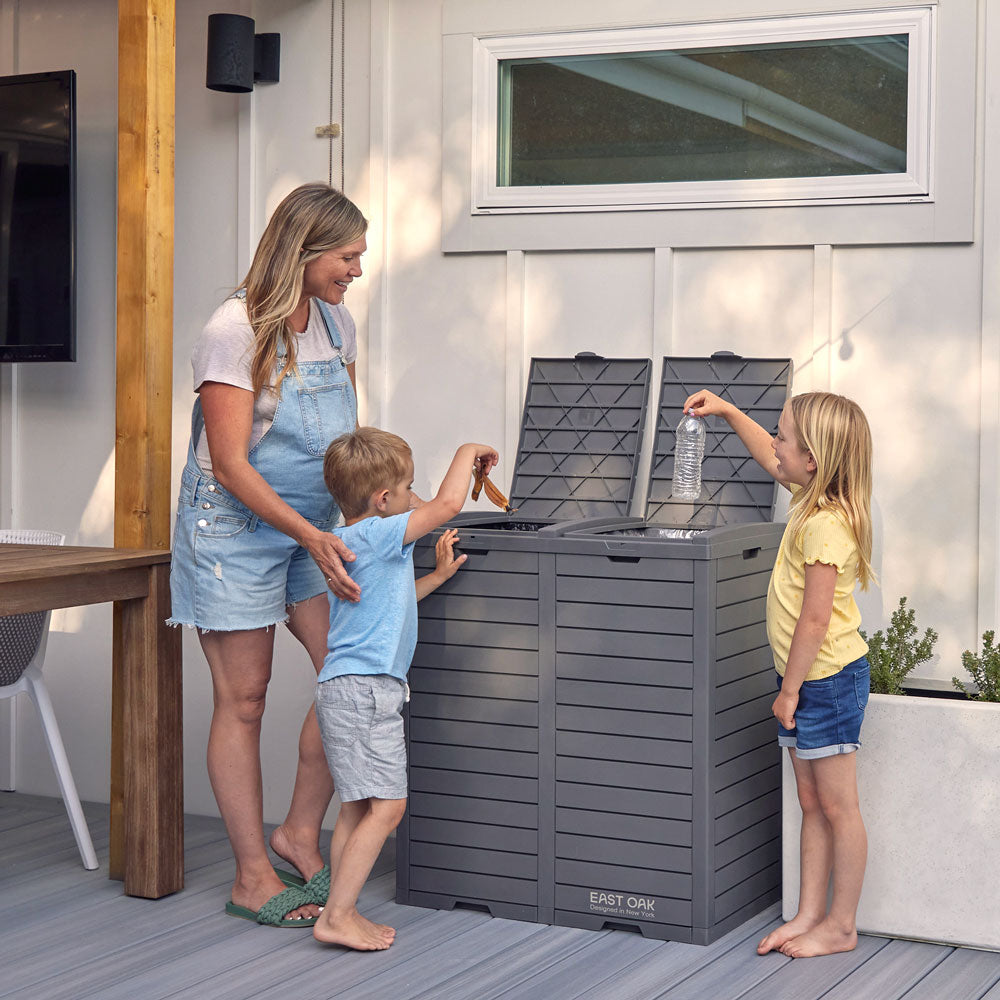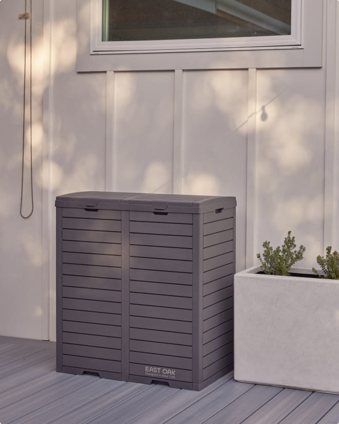 Our 76-gallon East Oak trash can is built for larger spaces, with weatherproof construction that withstands all seasons, making it ideal for high-volume waste management indoors or out.