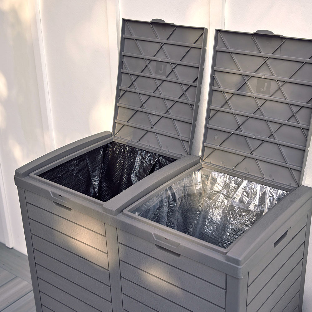 Dual-bag trash bin for two 33-40 gal bags. All-weather resin construction with simple 15-min assembly. Lightweight and easy to move with built-in handrails.