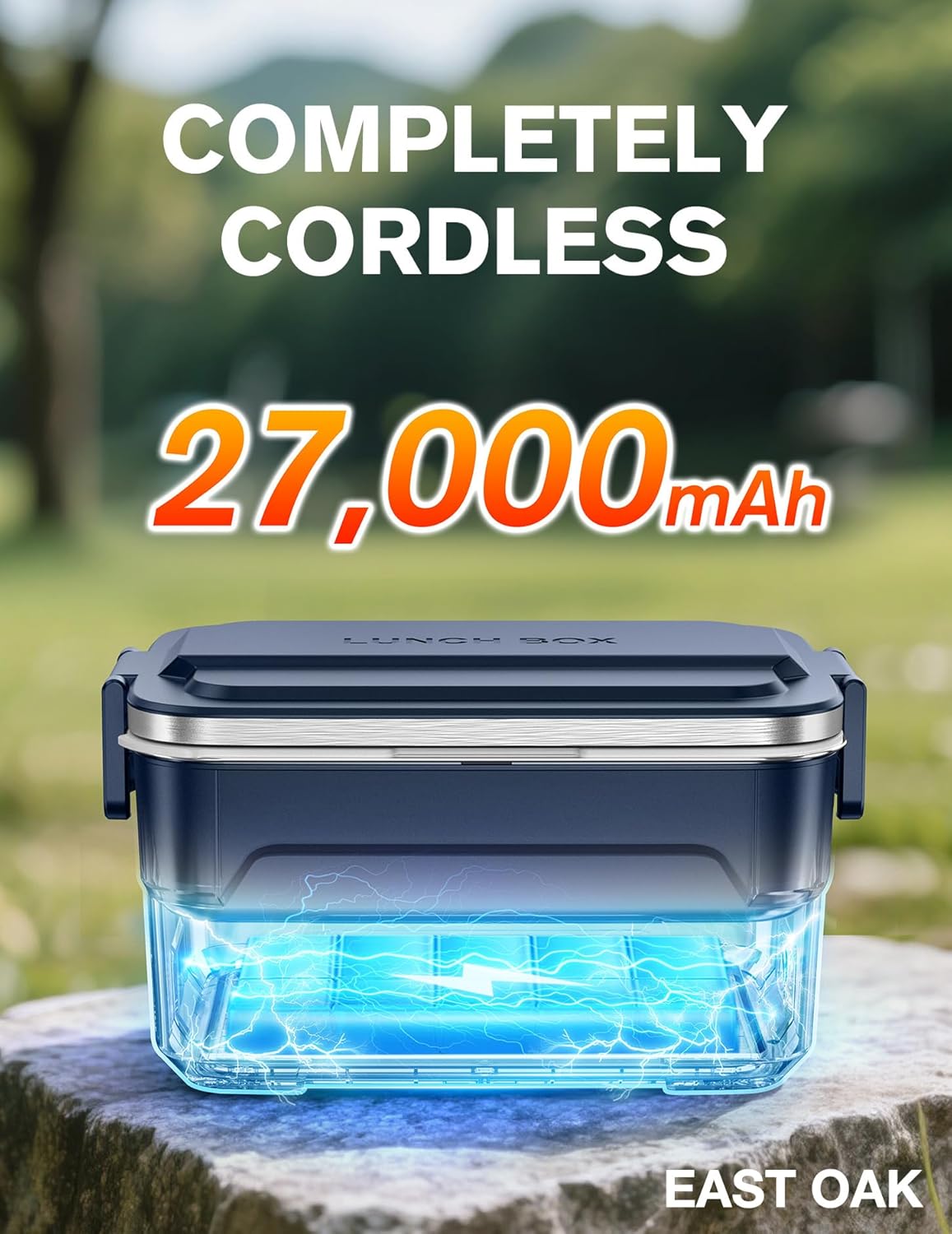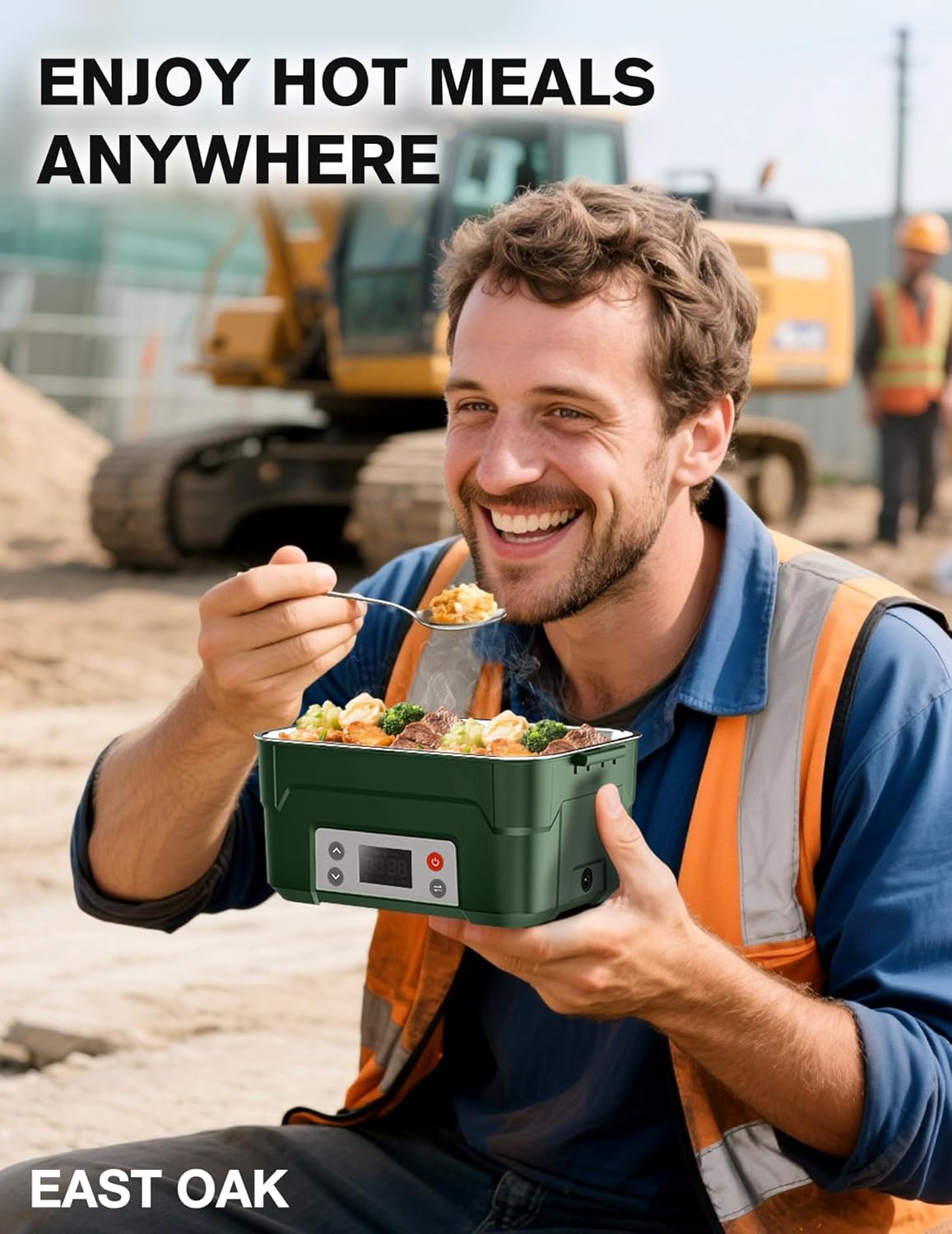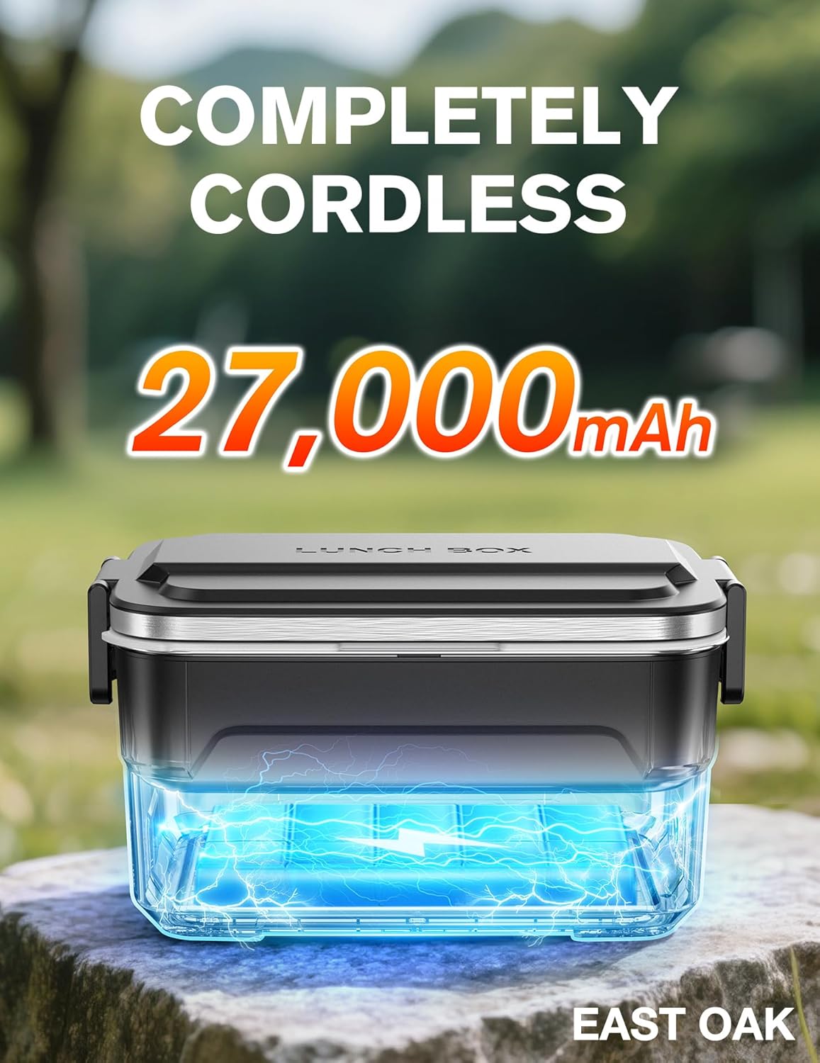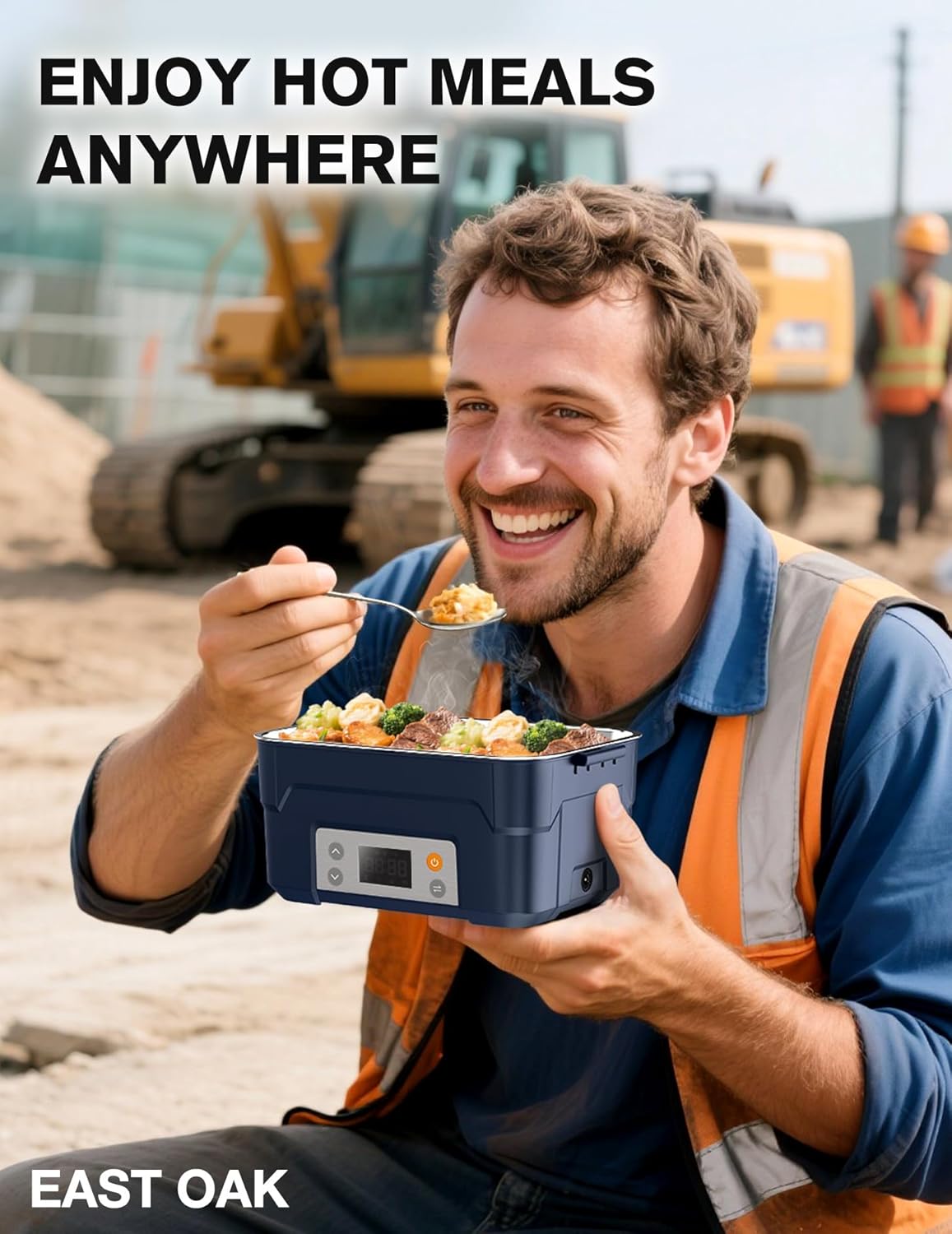 𝐂𝐎𝐑𝐃𝐋𝐄𝐒𝐒 𝐇𝐄𝐀𝐓𝐈𝐍𝐆 | No outlets? No problem! EAST OAK self heating lunch box for men features a built-in battery, allowing you to heat meals anywhere. The real-time battery level display ensures reliable heating