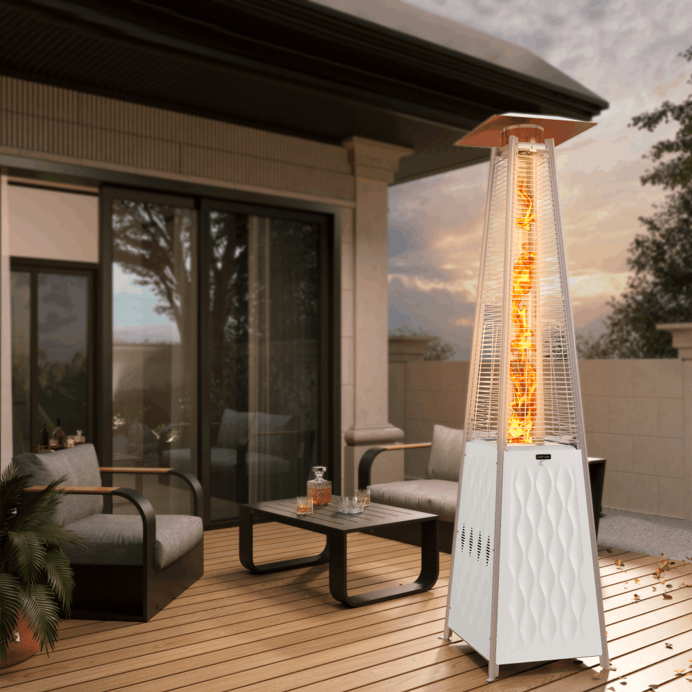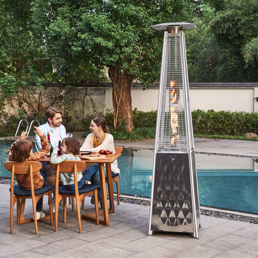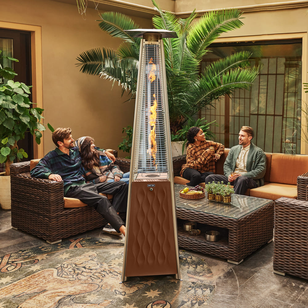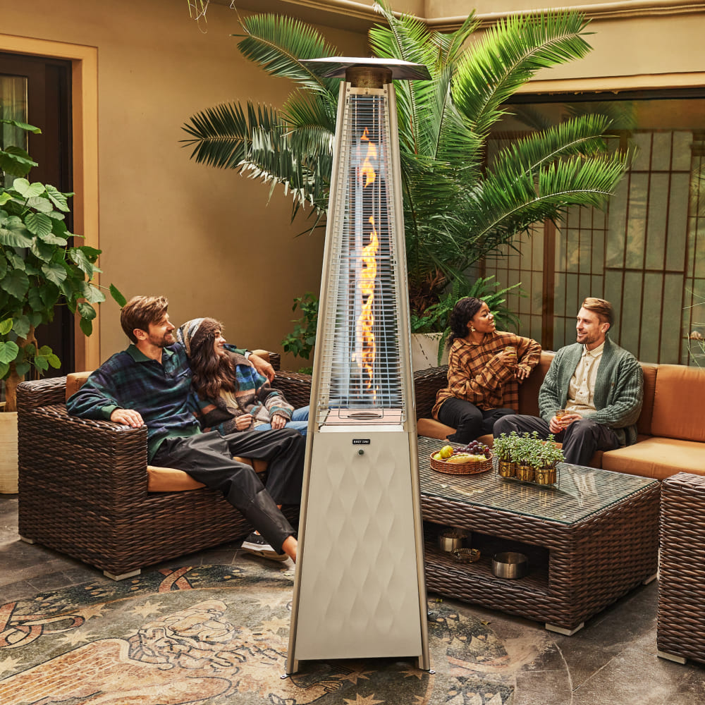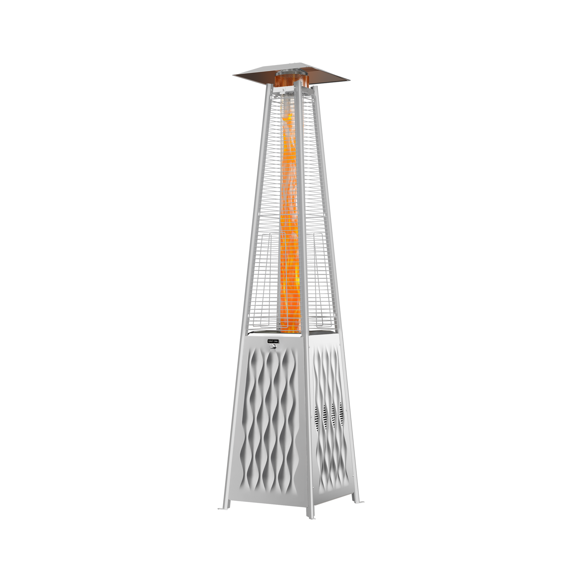 East Oak Pyramid Patio Heater, 48,000 BTU outdoor heater with quartz glass tube, perfect for commercial & residential use. Includes wheels for easy mobility.