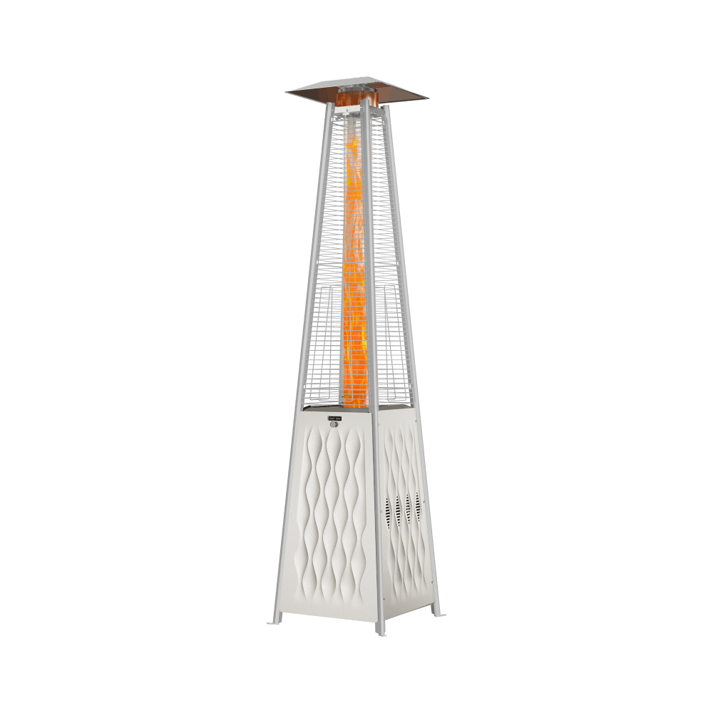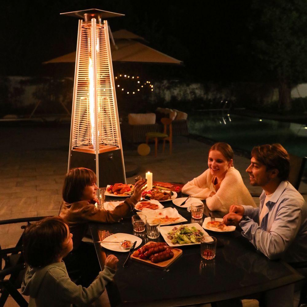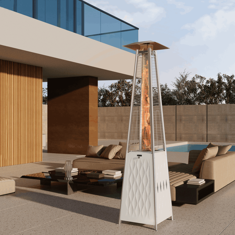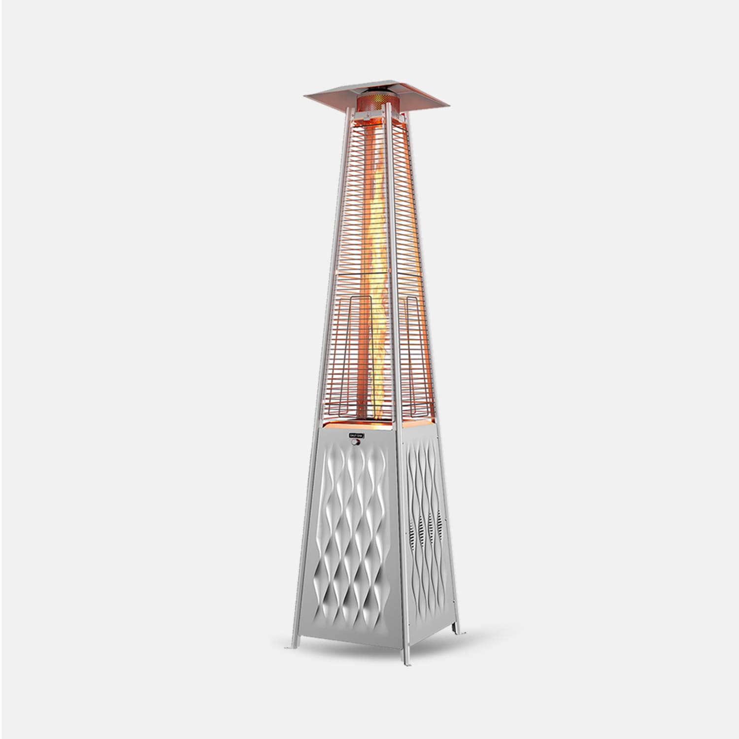 East Oak Pyramid Patio Heater, 48,000 BTU outdoor heater with quartz glass tube, perfect for commercial & residential use. Includes wheels for easy mobility.
