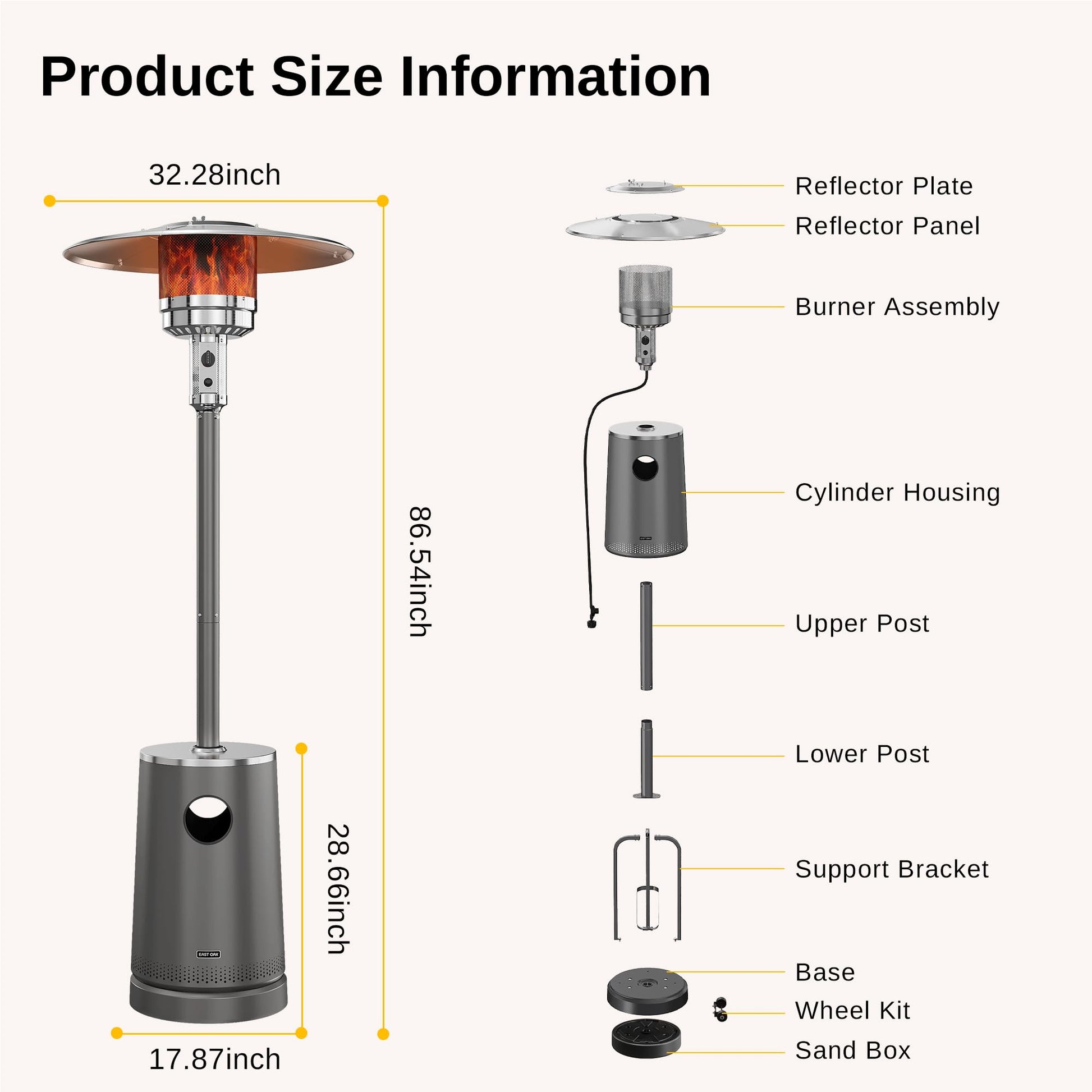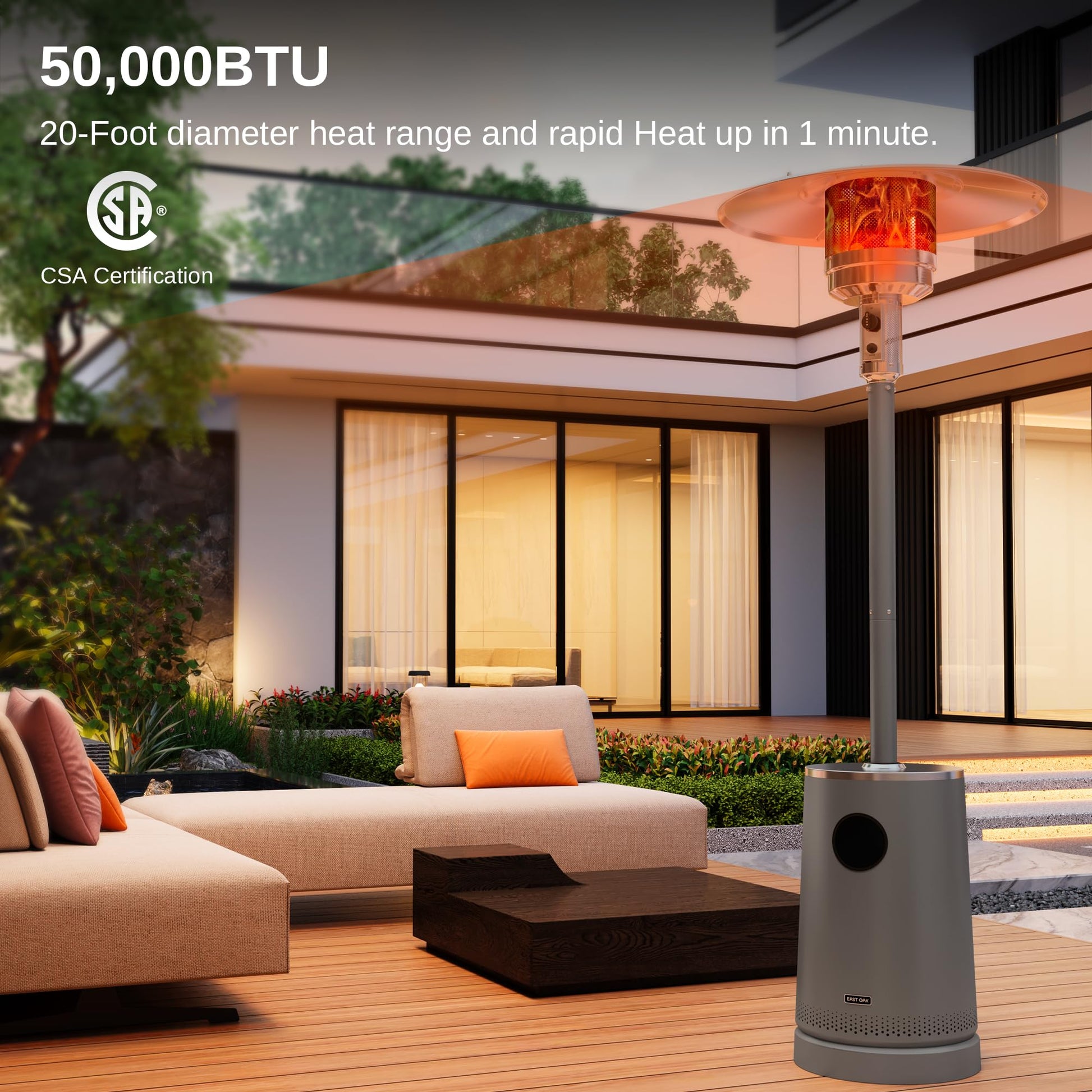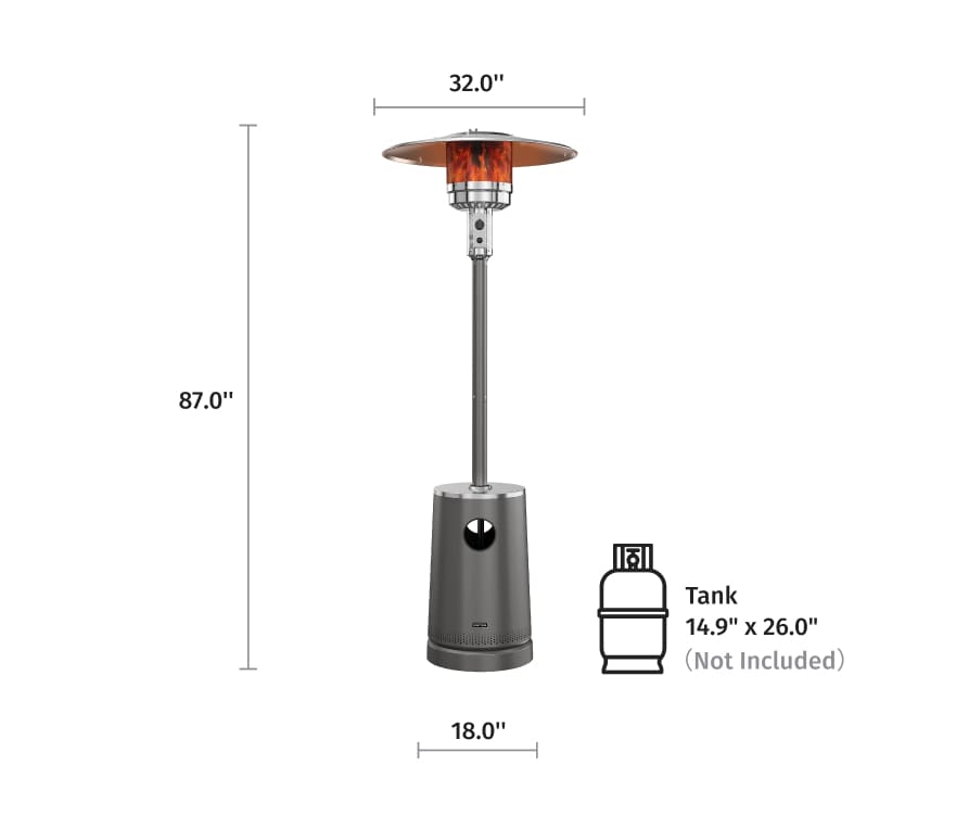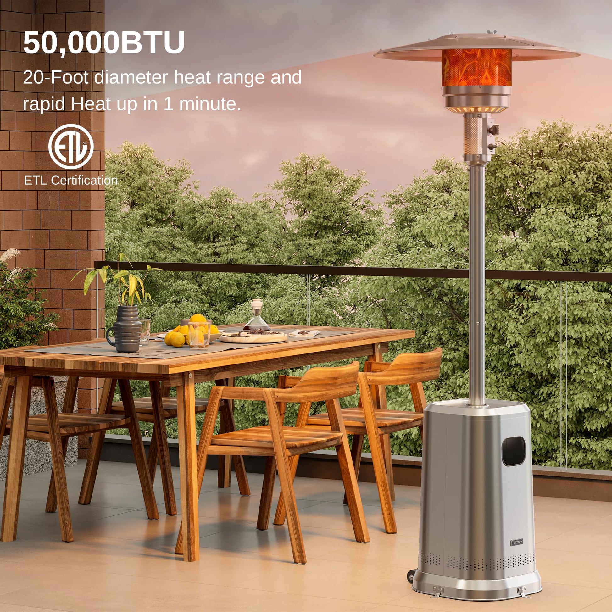 East Oak 50,000 BTU Propane Patio Heaters with Cone Table. Up to 20-foot diameter heat range. Perfect for patios, yards, restaurants, and bars. Pair with a free sand box for excellent stability.